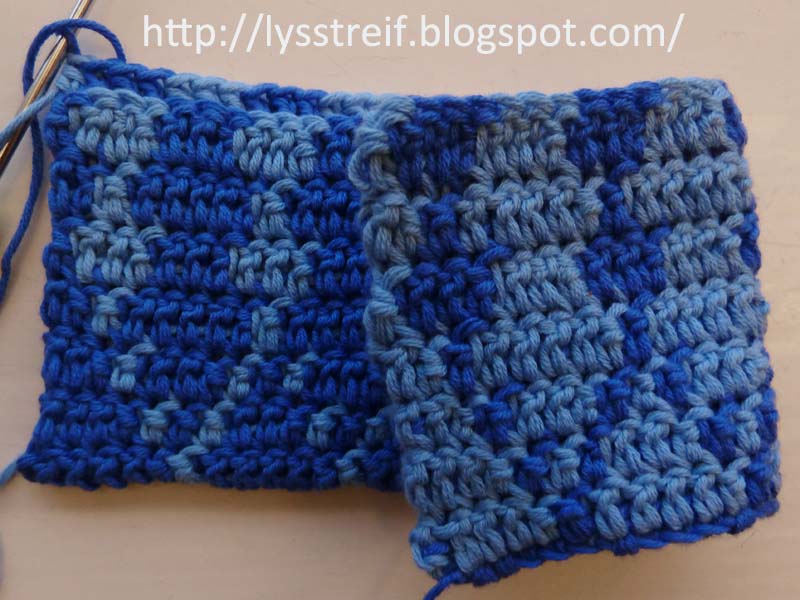 Det eksisterer også en annen doubleface-teknikk innen hekling som jeg har lyst til å prøve en eller annen gang. På engelsk betegnes den som bl.a. "Interlocking Filet Stitch" og "Intermeshing Crochet". Eksempler på hvordan det kan se ut, finner du på Sylvia Cosh og James Walters sin nettside. På sin side "Workshop" har de lagt ut forklaringer på hvordan teknikken utføres, se PDF nr. 18 og 19. En annen god forklaring med bilder ligger her. Og til sist, et større prosjekt er beskrevet hos Megan Mills. Hun har forresten også noen hekle- og strikketips som er verdt å sjekke :)